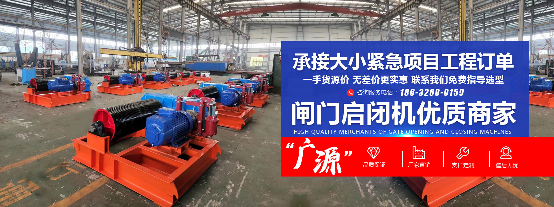 新河縣廣源水利機械有限公司是從事水工機械啟閉機、閘門、螺桿式啟閉機、固定卷揚式啟閉機、移動卷揚式啟閉機、鑄鐵閘門、鋼制閘門、不銹鋼閘門、拍門、回轉清污機、格柵清污機及粉碎清污機,攔污柵、橡膠止水的專業制造、生產及指導安裝的綜合性廠家,是制造、銷售、安裝一體化的規模型水利工程機械生產企業。   我廠主導產品:   1、螺桿式啟閉機0.3-100T;手推帶鎖式螺桿啟閉機;手輪啟閉機;QLP平推螺桿式啟閉機0.5-2T;QLF三防型全封閉磁力鎖螺桿式啟閉機0.3T-30T;QLC側搖螺桿式啟閉機0···
